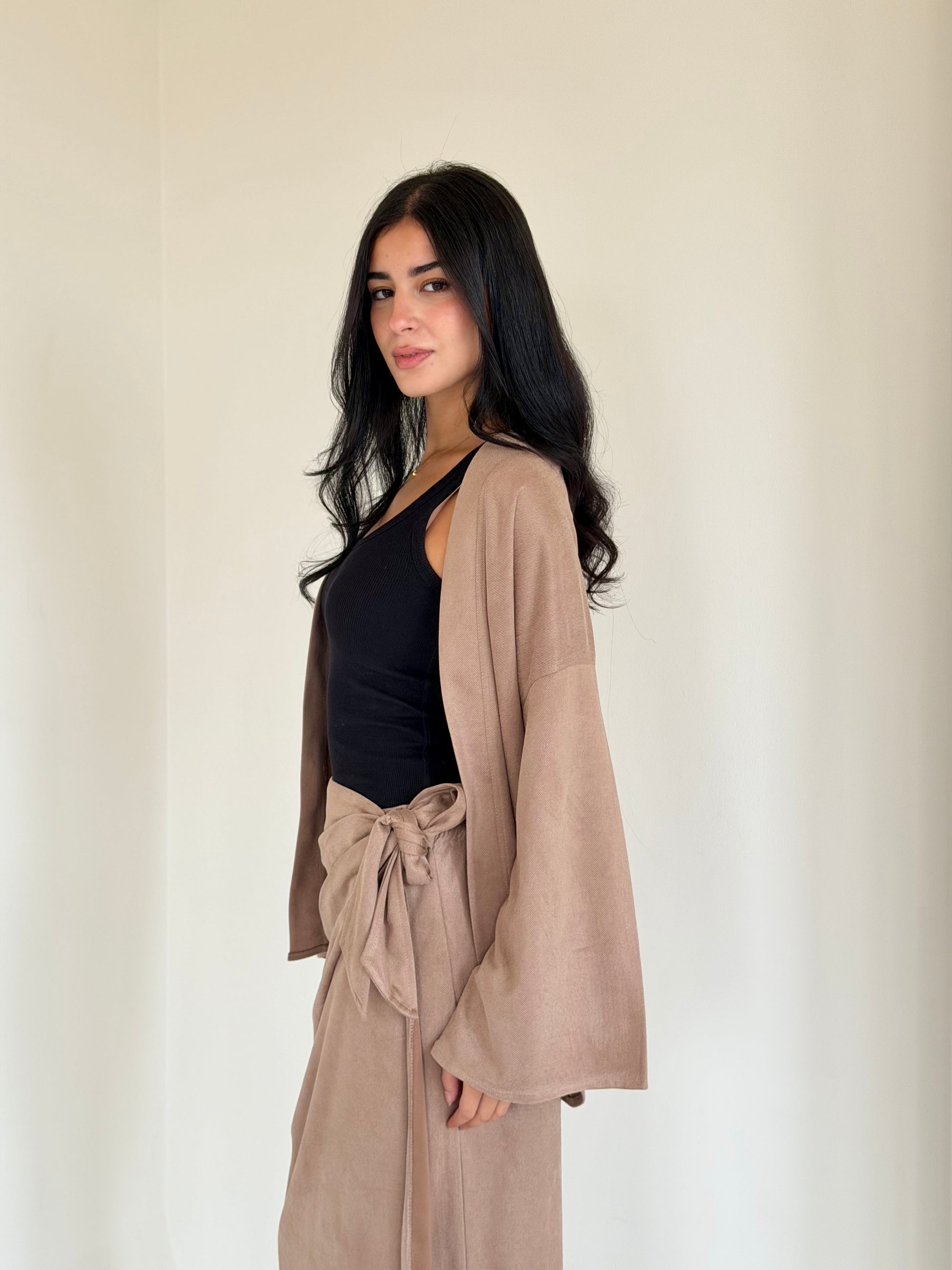 Designed with effortless sophistication, the two-piece set features a flowy kimono jacket paired with a sleek straight-cut skirt, blending comfort and classic style in perfect harmon