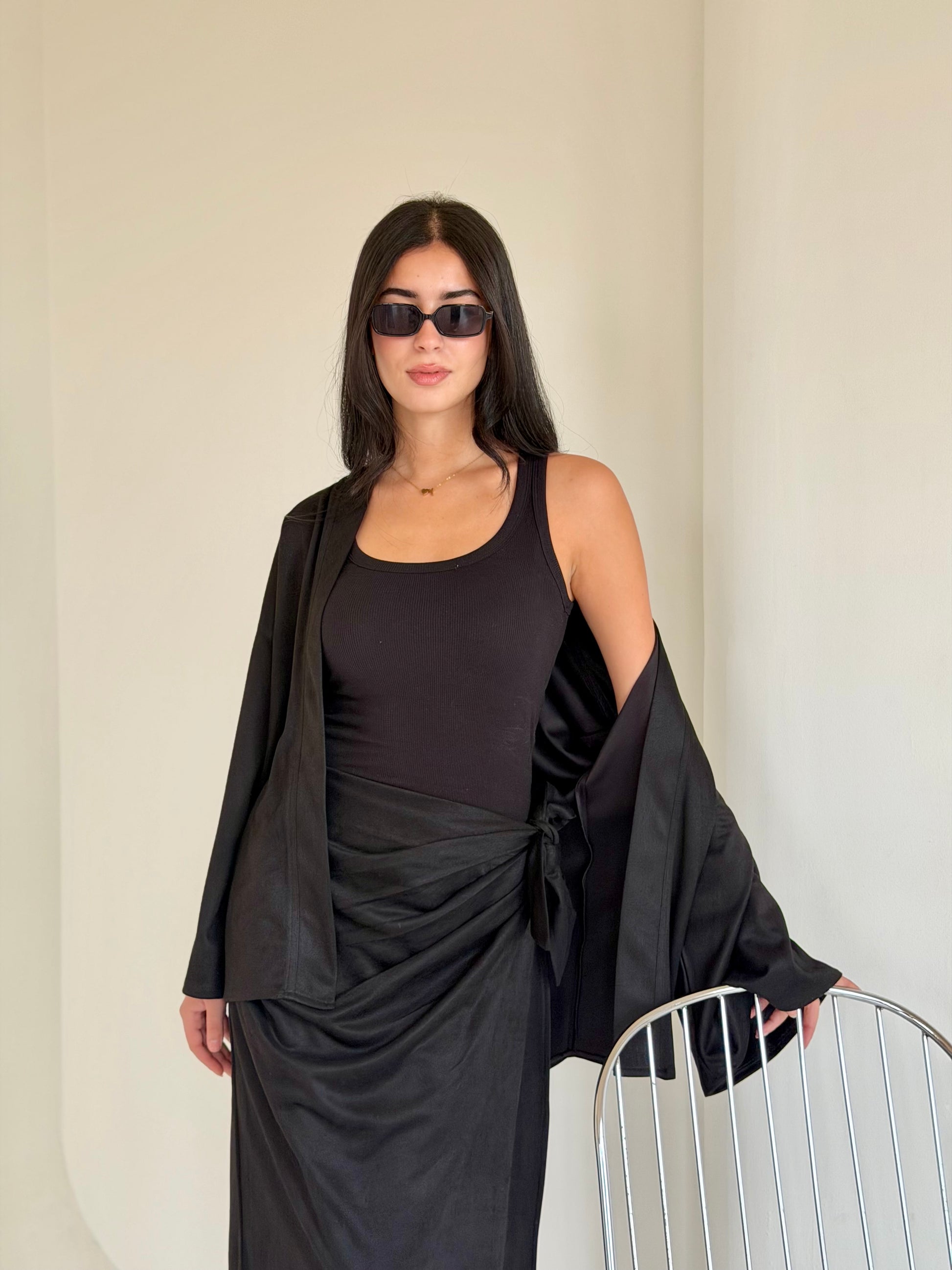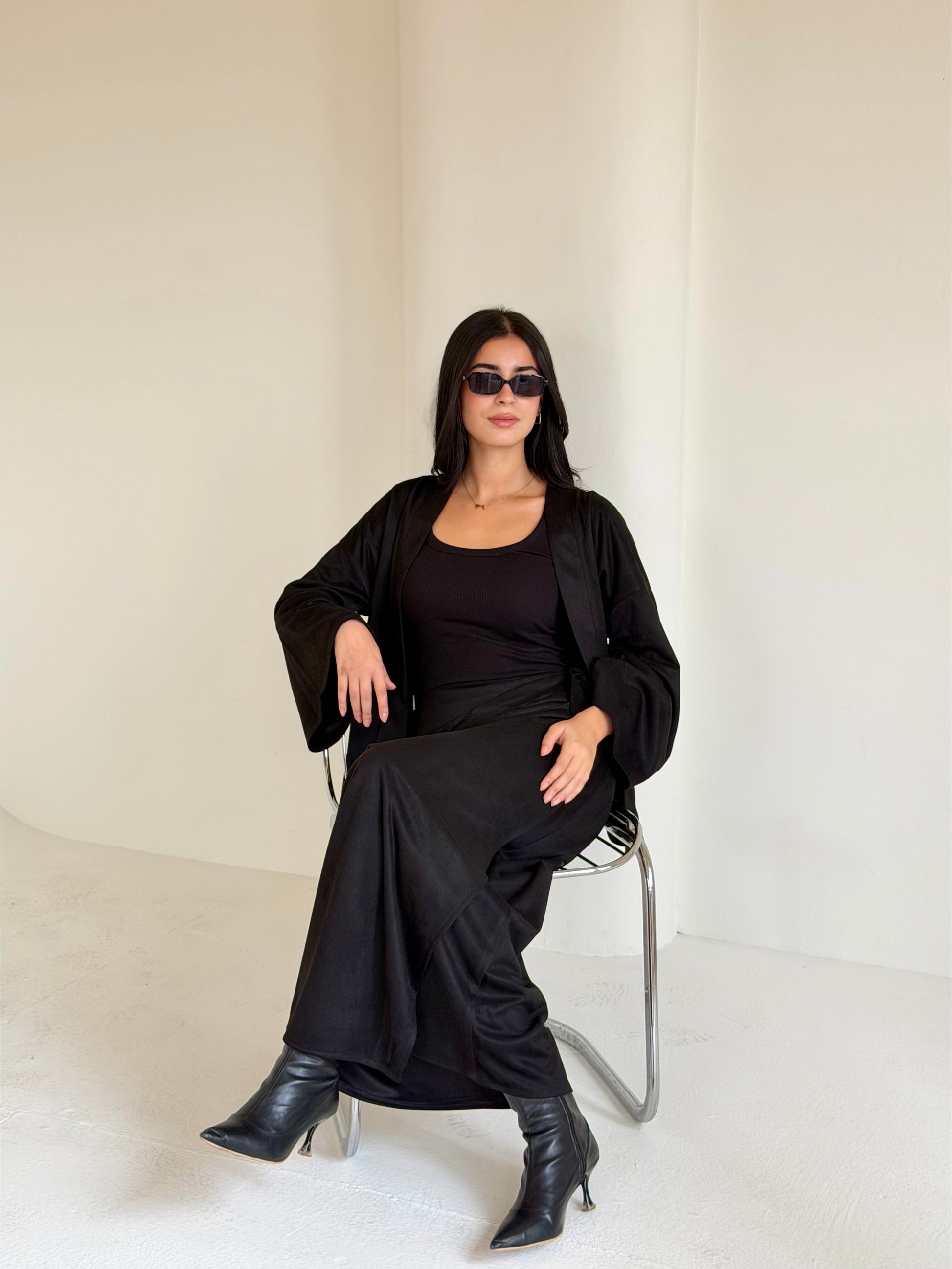 Designed with effortless sophistication, the two-piece set features a flowy kimono jacket paired with a sleek straight-cut skirt, blending comfort and classic style in perfect harmon