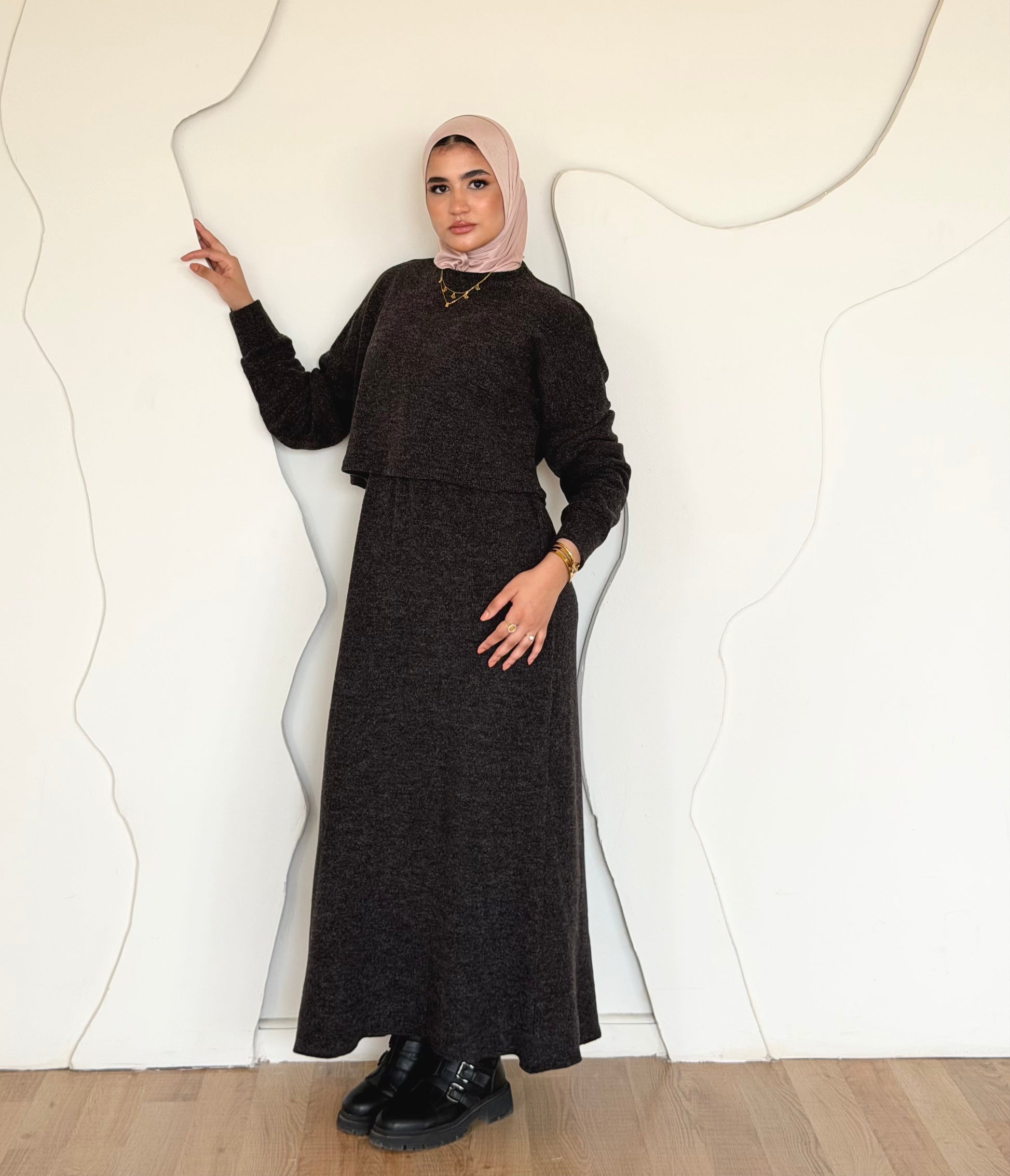 Wrap yourself in warmth and elegance with the Haven Duo Set — a two-piece winter favorite featuring a fitted ribbed dress paired with a cozy cropped cape.